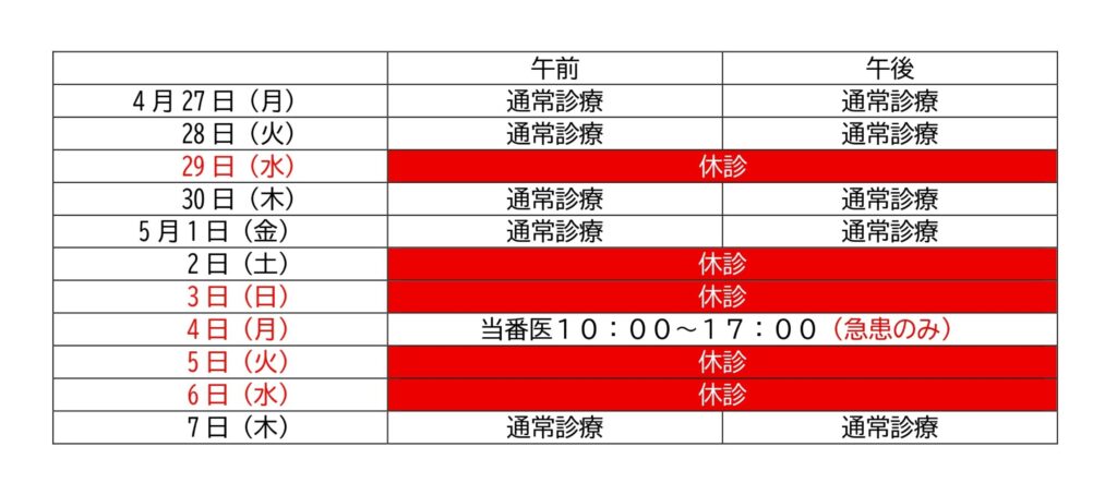 2026年4月6日 / 最終更新日 : 2026年4月6日 infodesk ☆4・5月大型連休中の診療について 下記のとおり診療いたします。 大変ご迷惑をおかけしますが、どうぞよろしくお願い申し上げます。 ※5月2日(土)は休診になります。 澤医院